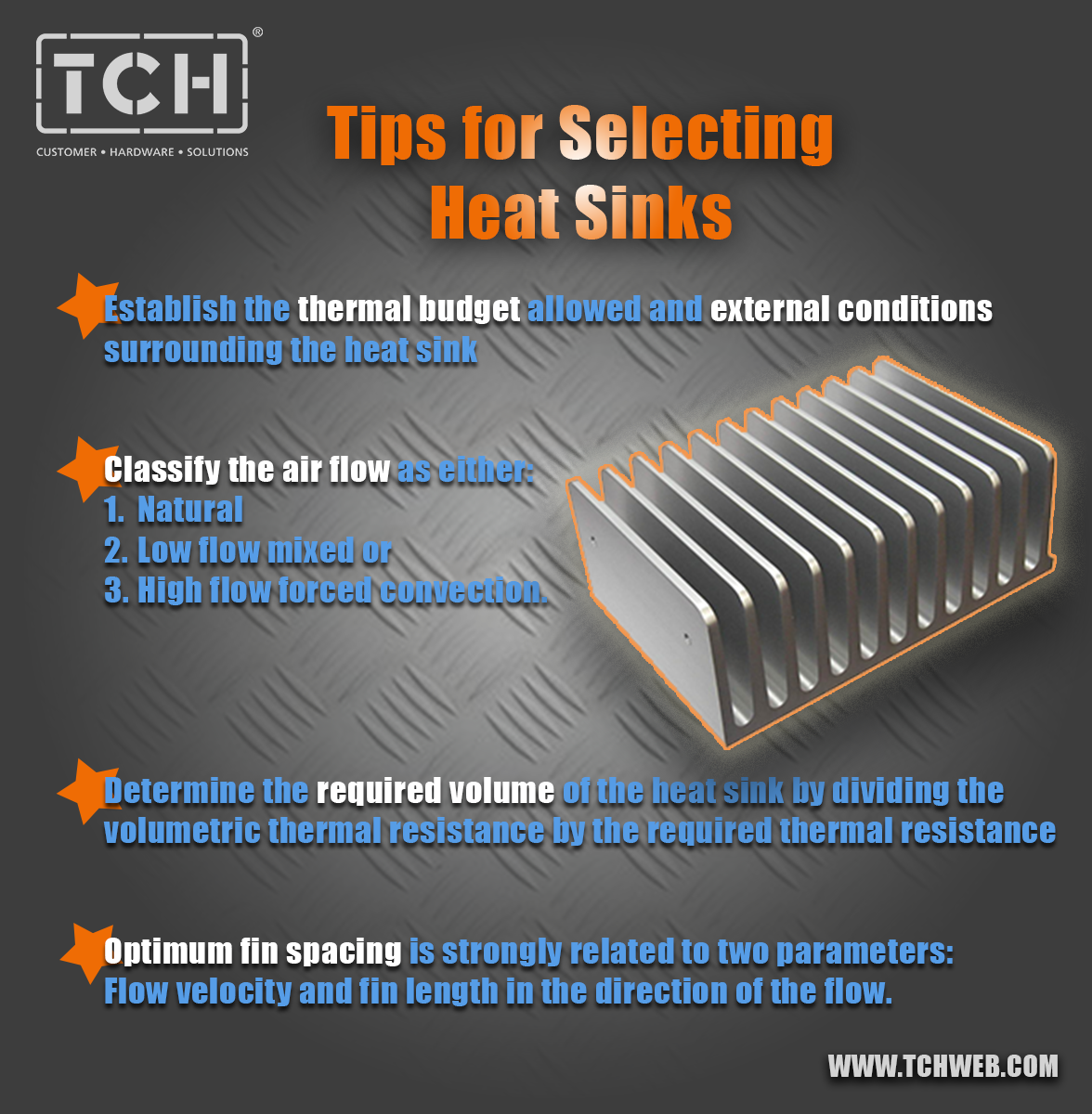 Establish the thermal budget allowed and external conditions surrounding the heat sinkClassify the airflow as either:1. Natural2. Low-flow mixed or3. High-flow forced convectionDetermine the required volume of the heat sink by dividing the volumetric thermal resistance by the required thermal resistance.Optimum fin spacing is strongly related to two parameters:1. Flow velocity and 2. Fin length in the direction of the flow
